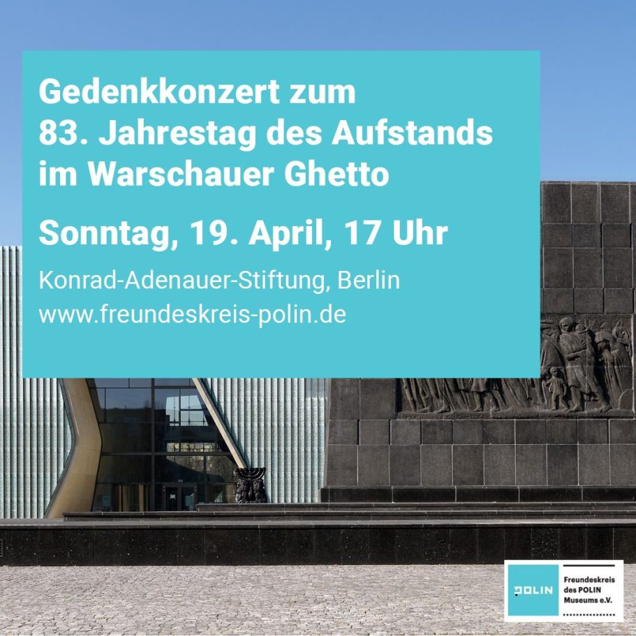 Am 19. April 1943 begann mit dem Aufstand im Warschauer Ghetto der größte bewaffnete Widerstandsakt von Jüdinnen und Juden während des Holocaust. Deswegen erinnert der Freundeskreis des POLIN Museums am 19. April 2026 in Berlin gemeinsam mit der Konrad-Adenauer-Stiftung, dem Warschauer POLIN Museum der Geschichte der polnischen Juden und dem Polnischen Institut Berlin mit einem Gedenkkonzert an den 83. Jahrestag.
